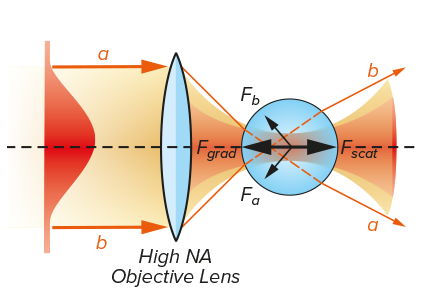 The image above illustrates the basic principle of how the forces experienced by an optically transparent sphere are perfectly balanced when at the focus of the laser beam. For this reason, these spheres are often attached to more complex molecules to allow them to be more easily manipulated under a microscope. For example, if a biological specimen is biochemically attached to a micron-sized glass or polystyrene bead that is then trapped, or by attaching a single molecular such as kinesin, myosin, RNA polymerase to such a bead, people have been able to probe motor properties, elasticity, as well as the forces under which molecules breakdown or undergo a phase transition.