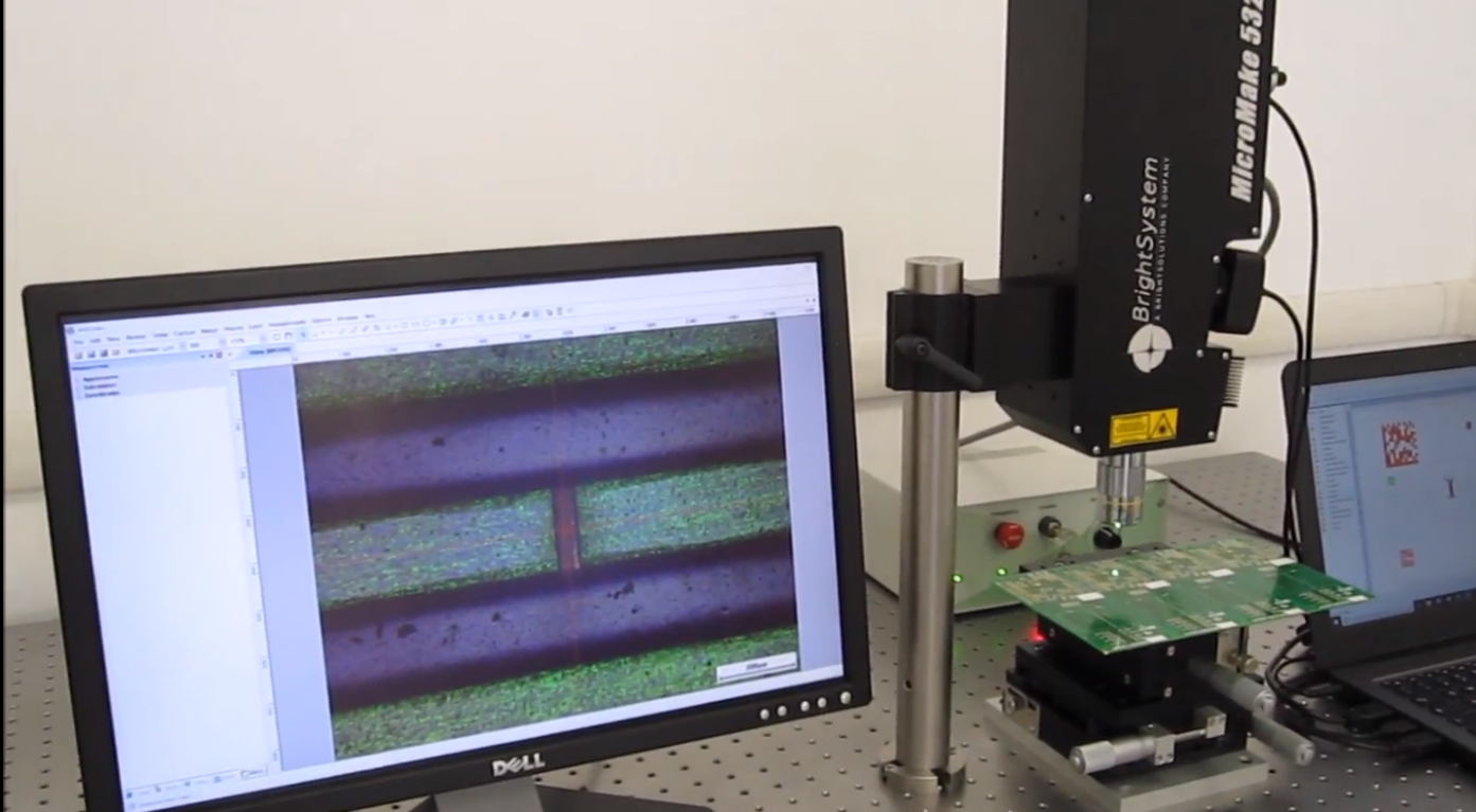 The MicroMake from Bright System is a completely integrated system; containing a compact micromachining laser, a high-quality video microscope, and control software all in one unit. Due to its monolithic system design, it can be easily set up and configured by technicians and operators, without the need for an on-site electro-mechanical engineer. The MicroMake’s user-friendly and intuitive graphical user interface control software allows for the design of any arbitrary shape to be applied as a cutting shape on the work-piece, making it an extremely versatile laser precision tool. One of the most import features of this product is the embedded video microscope that allows the user to align the target in real-time and also monitor the ablation process. In the example shown below an operator is using the MicroMake system to perform a 100-micron track interruption on a printed circuit board. In this case, the operator used the XYZ stage to align the track under the targeting crosshair and then selected a pre-programmed shape from the software to produce a perfect rectangular interruption.